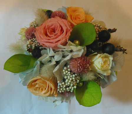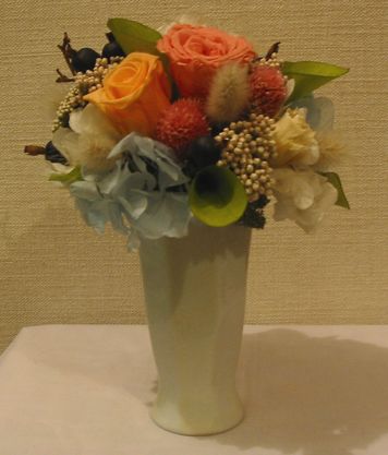 | 背の高めの真っ白の器に丸くアレンジしてみました。 ソフトクリームみたいです(笑) ポイントは葉っぱをくるっと丸めて中にパールを入れてあります。 背の高さが少しありますが、横幅は押さえてありますので、細長い場所にいかがでしょうか? 【注意】 同じ花器ご用意できません。 同じような花器で代用致します。 【使用花材】 バラ あじさい ライスフラワー ブラックベリー ポプルス 千日紅 パール |