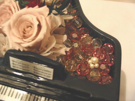 ピアノの花器にアレンジしてます。 こちらの花器はお客様の持ち込みでした。 もちろんこちらでご用意することも可能です。 黒と白のピアノの花器があります^^ お花ばかりではゴチャゴチャしてしまうので、半分だけお花アレンジして、半分はビーズを敷き詰めてあります。 とてもかわいいアレンジです。 ビーズ部分に香水を振っていただくこともできます。 音楽をされてる方などのプレゼントにお勧めのアレンジです! 【注意】 同じ花器ご用意できません。 同じような花器で代用致します。 【使用花材】 バラ あじさい ノリウツギ ビーズ3色 パール |