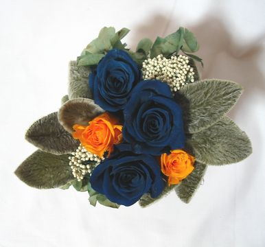 ブルーとオレンジ 夜のイメージで作ったアレンジです。 はっきりした色合いばかりでも綺麗ですね! 周りには沢山ラムズイヤーの葉っぱを入れました 【注意】 同じ花器ご用意できません。 同じような花器で代用致します。 【使用花材】 バラ ライスフラワー あじさい ラムズイヤー